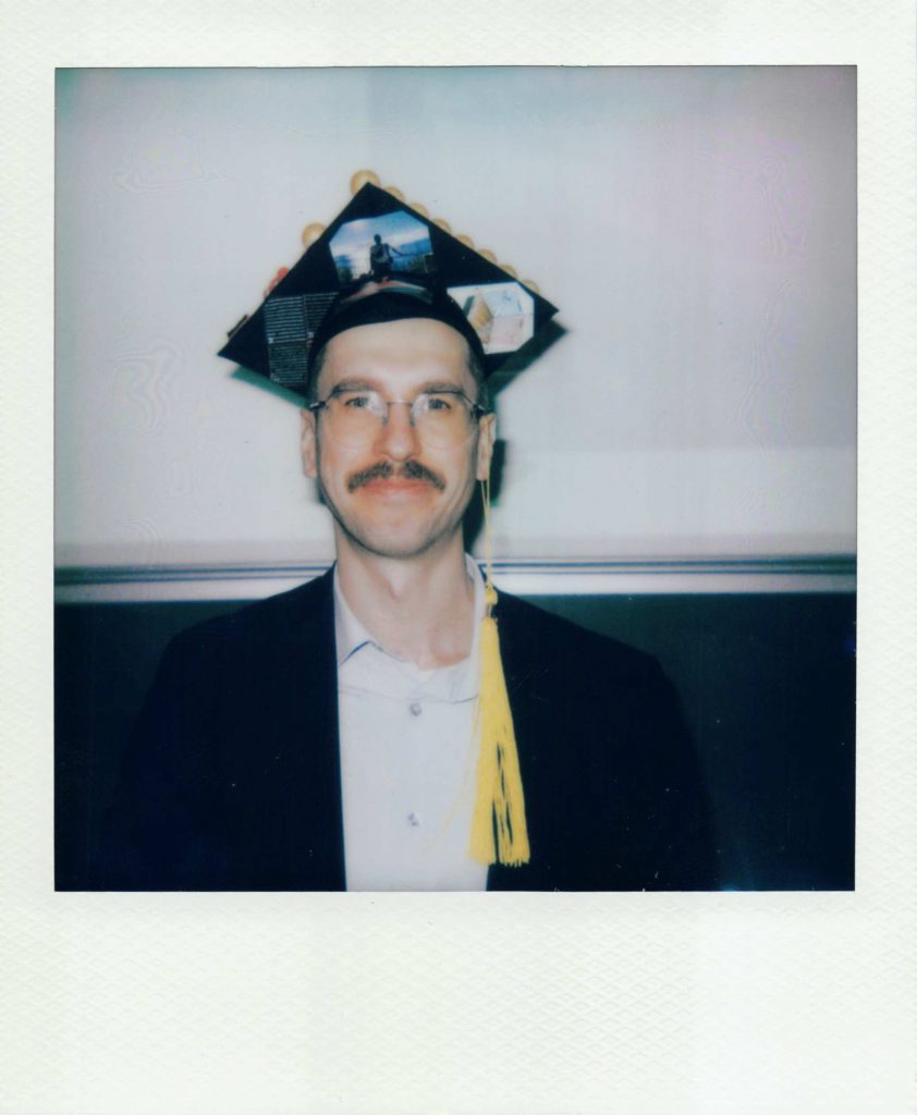 Sezer wearing his mortarboard. In our research group, it is a long-standing tradition that each doctoral candidate receives a freely designed mortarboard. These hats are individually decorated and often reflect key scientific concepts, experimental motifs, or personal milestones from the doctoral project—symbolically capturing the unique research journey of each PhD candidate.