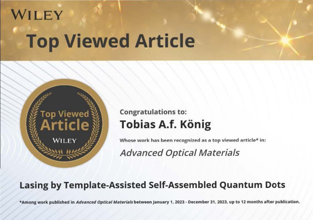 We are proud to share that our recent publication, Lasing by Template‐Assisted Self‐Assembled Quantum Dots,” has been recognized as a Top-Viewed Article by Advanced Optical Materials for the year 2023!